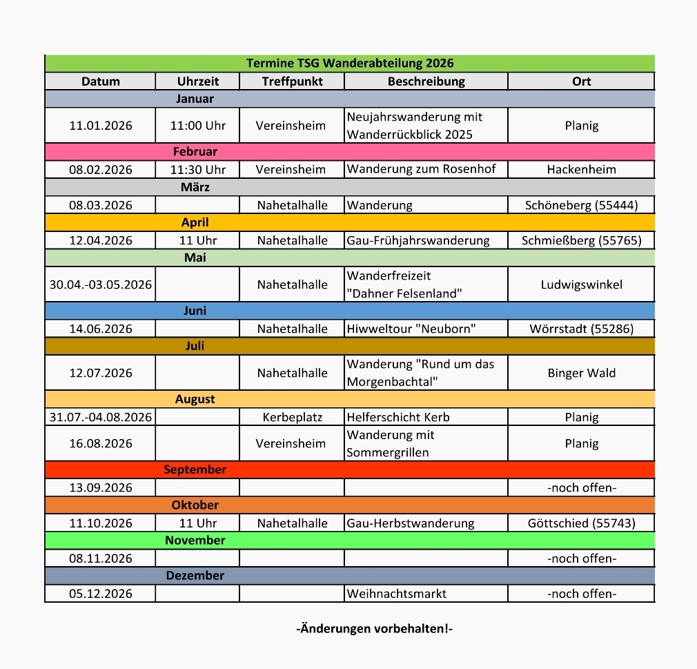 Der Gau-Wandertag wurde im März 2017 zusammen mit dem Turngau Bingen organisiert und in erfolgreich in Planig durchgeführt. Die Wanderabteilung freut sich über Gleichgesinnte und heißt jeden Interessierten herzlich willkommen.